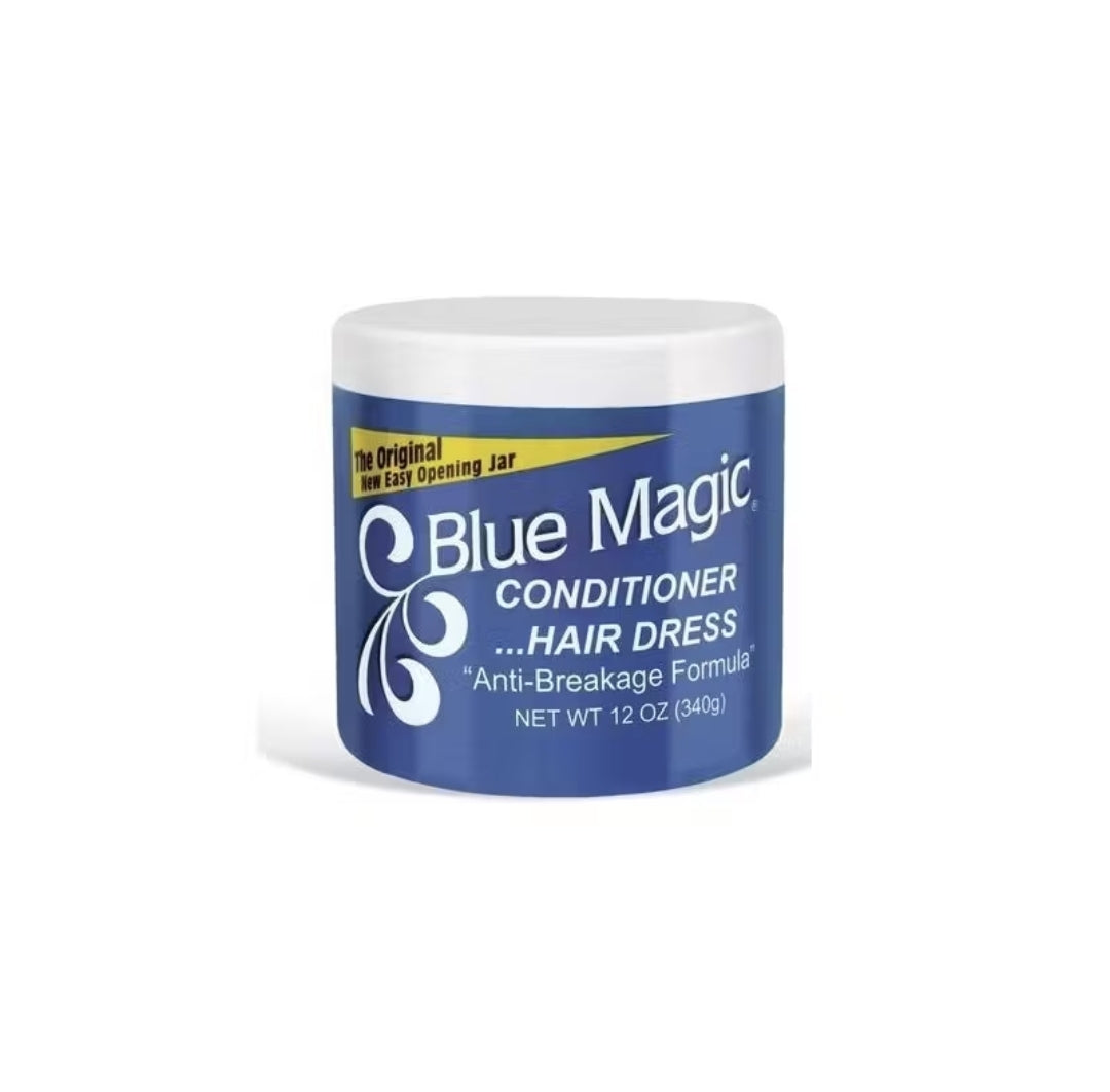 BLUE MAGIC CONDITIONER HAIR DRESS 12ozDirectionsApply Blue Magic Conditioner/Hair Dress to the hair and scalp, using finger tips to massage in thoroughly. Style as you please.IngredientsPetrolatum, Lanolin, Lecithin, Mineral Oil, Fragrance, Green 6, Violet 2